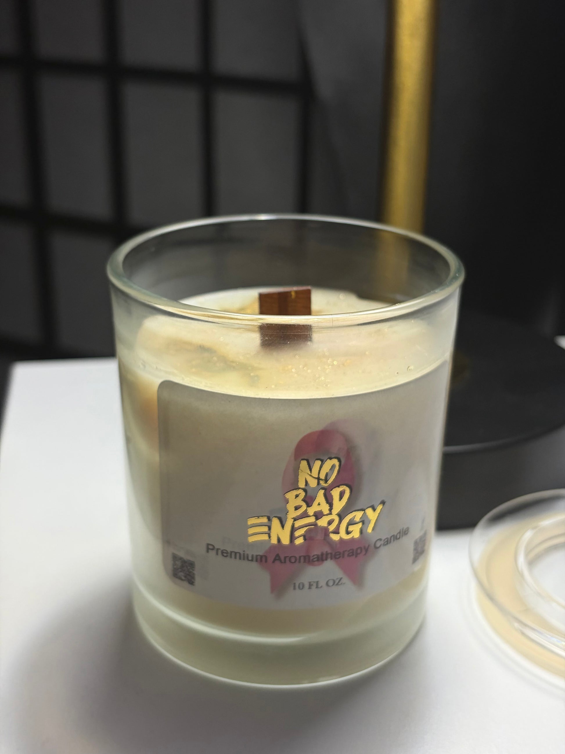 This special edition candle blends the same signature “No Bad Energy” fragrance you already love, grounding lemongrass, soothing Egyptian musk, and sacred Frank & Myrrh, with a heartfelt tribute to the warriors, survivors, and angels who’ve faced breast cancer.